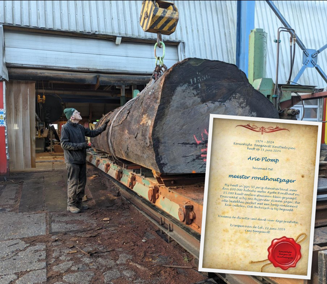 Arie heeft in zijn 50 jarige carrière als Rondhout zager meer dan 100.000 kuub Azobe stammen aan bestek gezaagd. (foto Arie bij de zaag) Dit lijkt ons een prestatie die weinig mensen zullen kunnen evenaren. (oorkonde Arie).